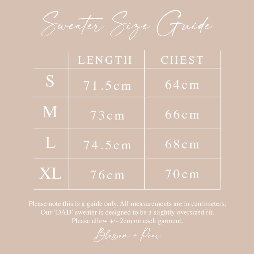 We recommend sizing up if you are wanting a larger, oversized fit. Please note this is a guide only, and fit will vary.